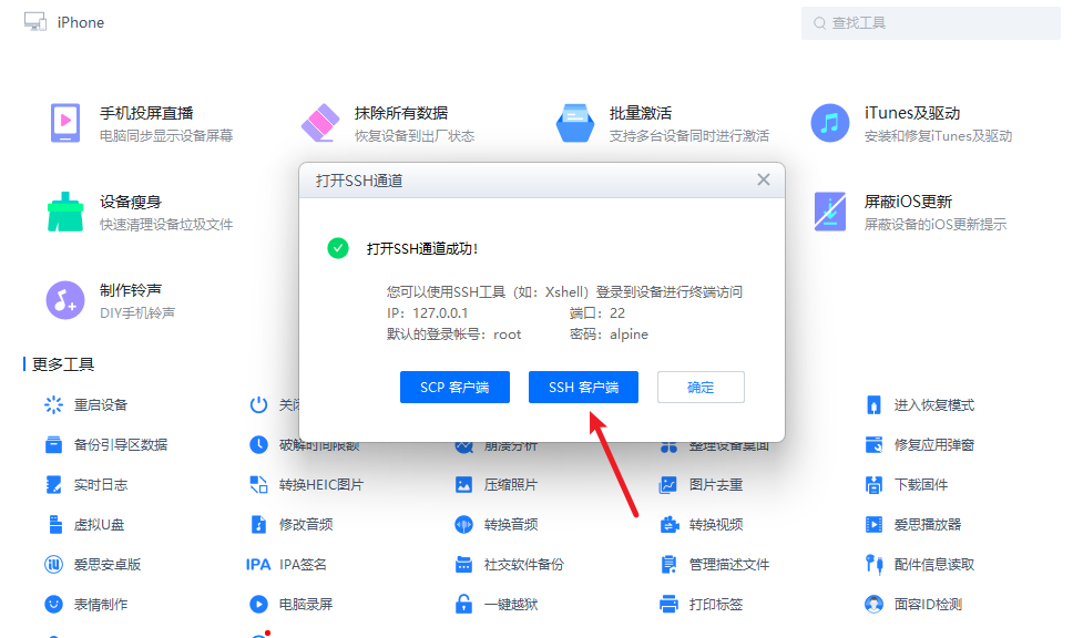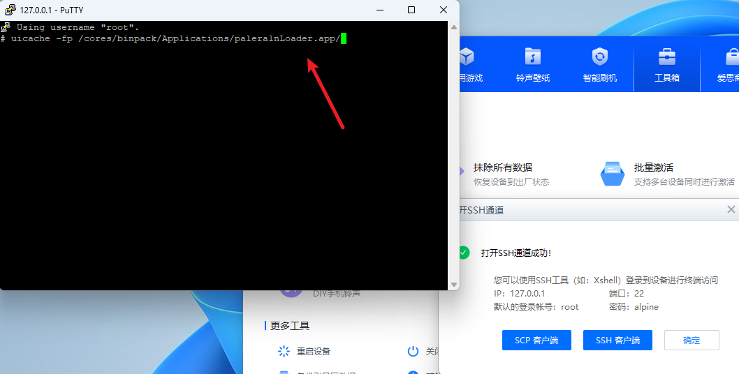 连接爱思助手,打开ssh通道,在命令行输入: