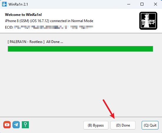 直到看到 All Done 提示,桌面出现 palera1n 图标,越狱完成。