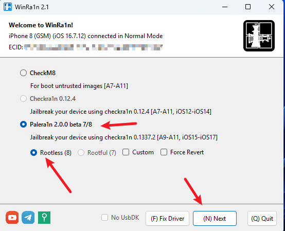 在 winra1n 里选择 Rootless,点击 Next,